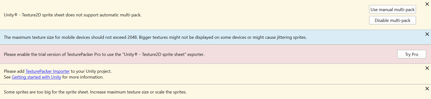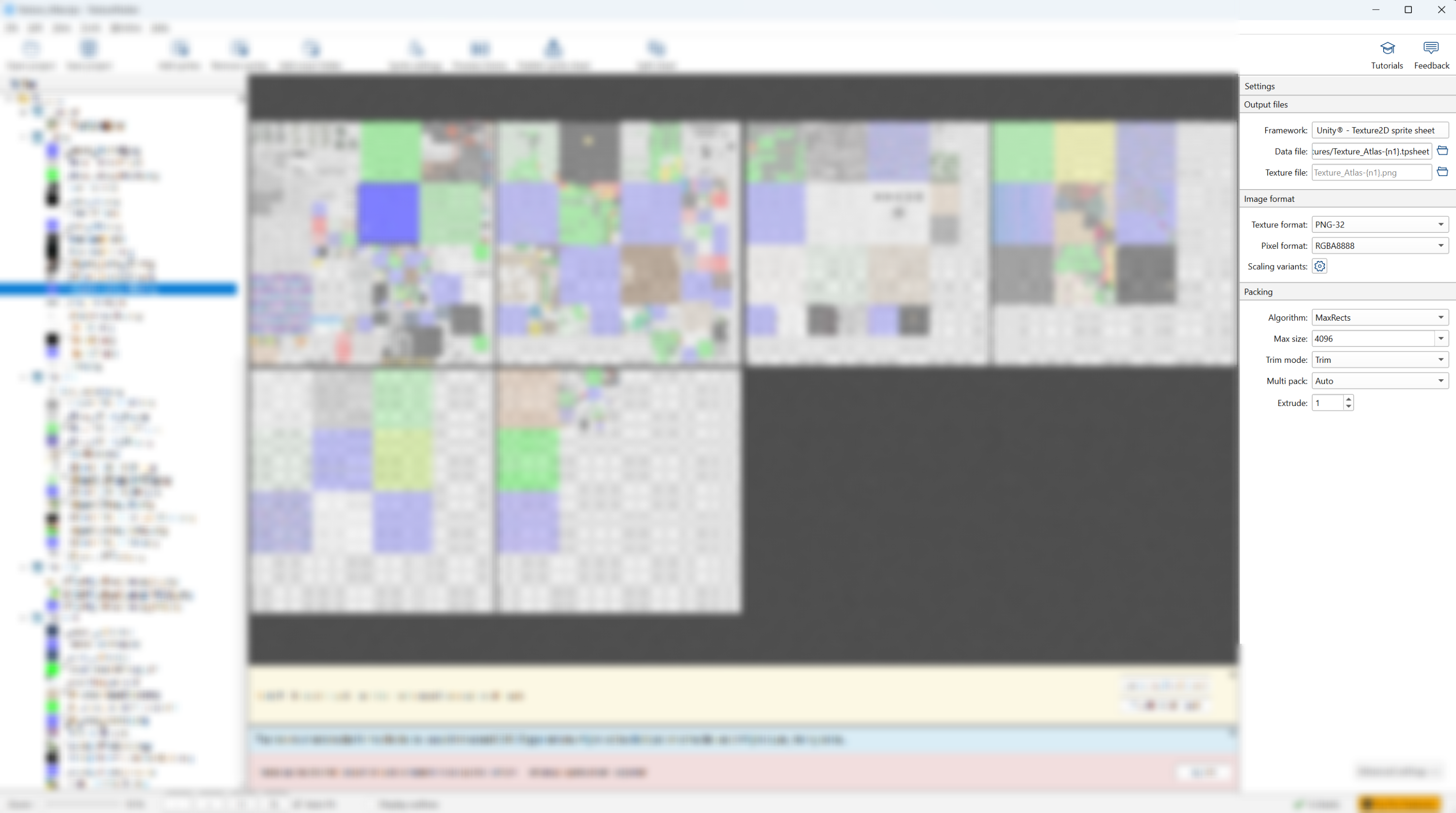 크고 많은 텍스쳐들을 한꺼번에 import 하여 많은 경고 메시지와 싸웠는데(주로 pro 라이선스를 쓰라는 얘기. free에서는 안 되는 기능들이 많다.) 어찌어찌하여 텍스쳐들을 패킹하는 데에는 성공했다. 세팅 값은 아래 스크린샷으로 첨부한다.