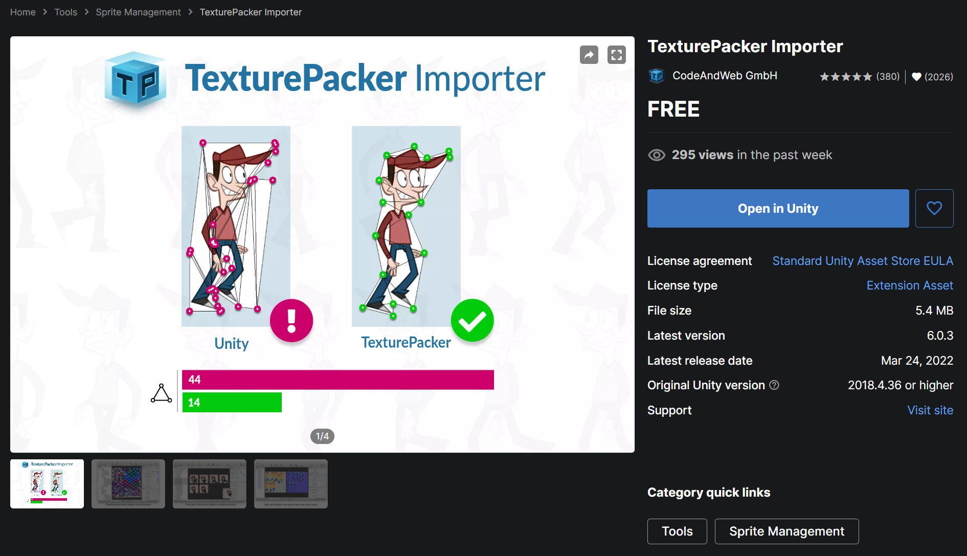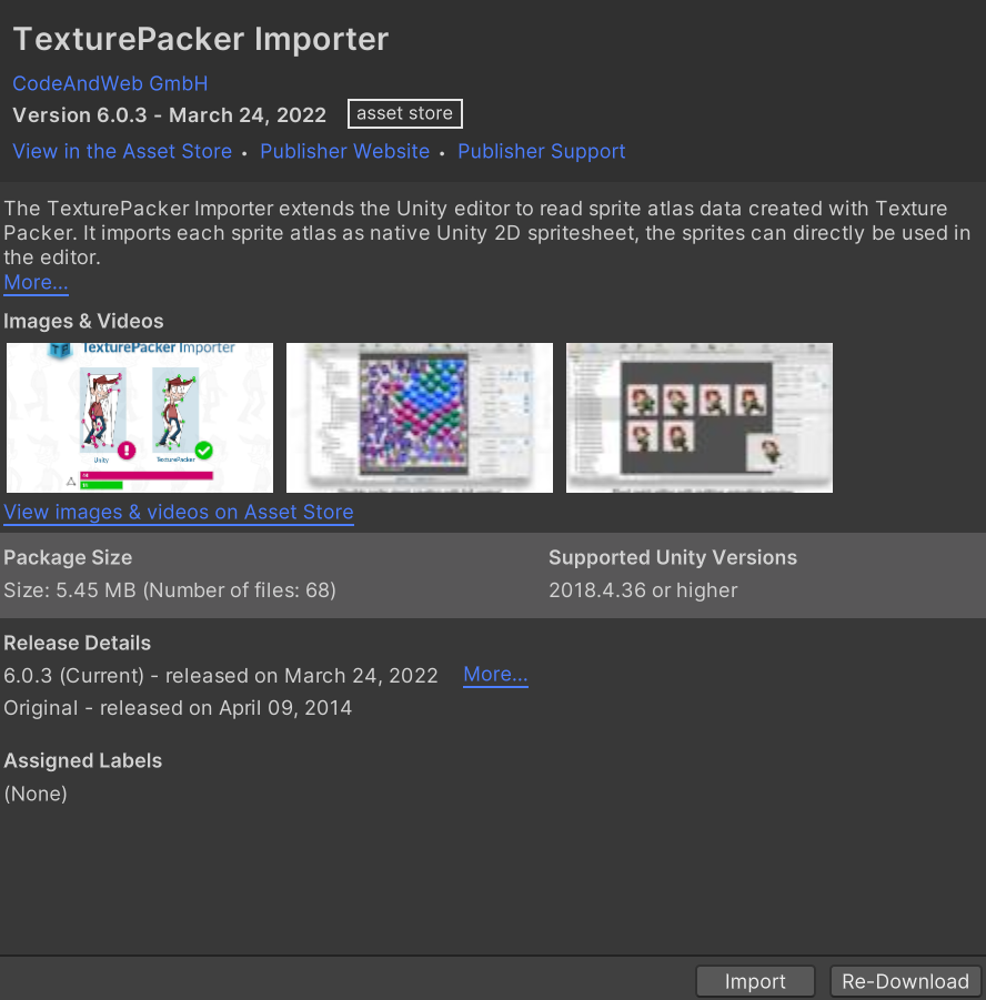 먼저, 에셋스토어에서 "TexturePacker"를 검색하여 프로젝트에 import 한다.(링크)