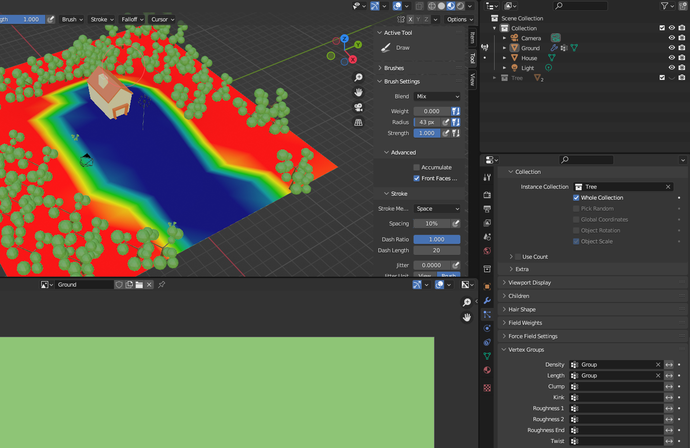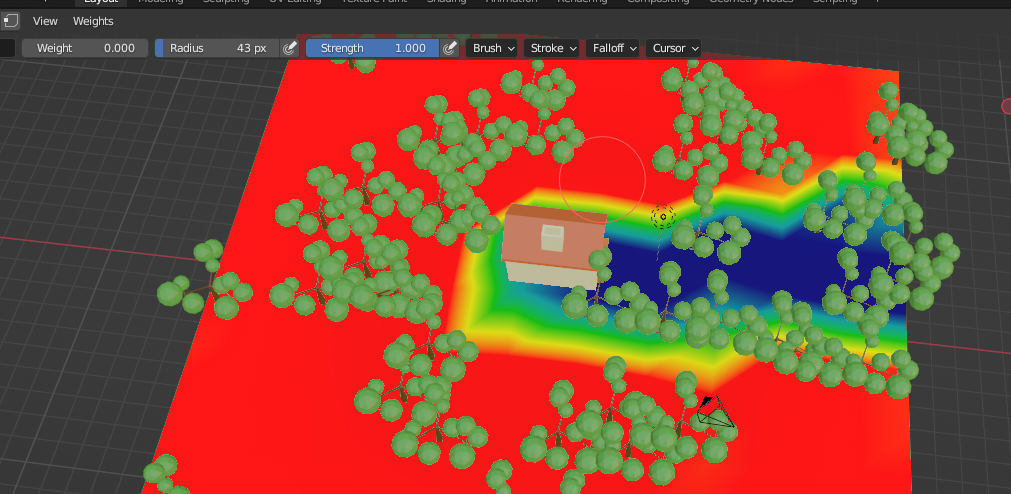 [Weight Paint]로 전환 후 전체를 Weight 1로 빨간색으로 칠한다. 집 주변과 길에는 나무가 생기지 않게 하기 위해 Weight를 0으로 칠한다.