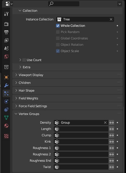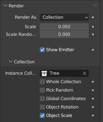 파티클 메뉴에서 [Render] - [Render As]를 [Collection]으로 변경한다. 나무를 Collection에 넣었기 때문