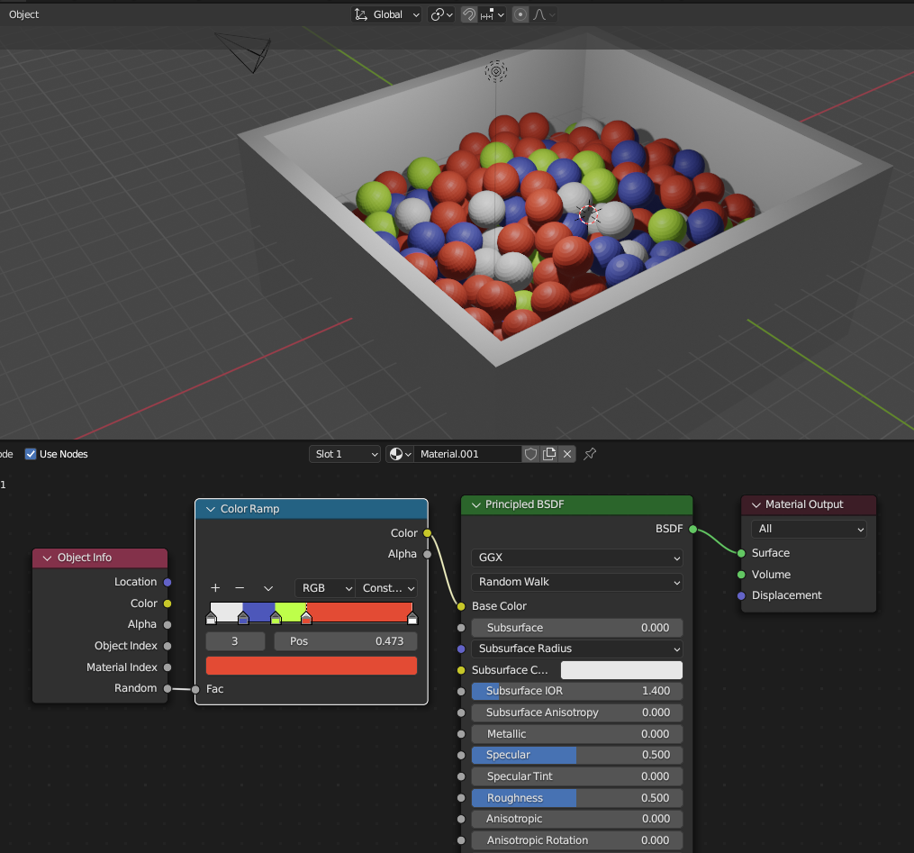 Color Ramp 노드의 Constant 를 이용해서 여러 색을 설정할 수 있다. 여기서 색의 면적은 그 색깔의 공 빈도를 나타낸다.