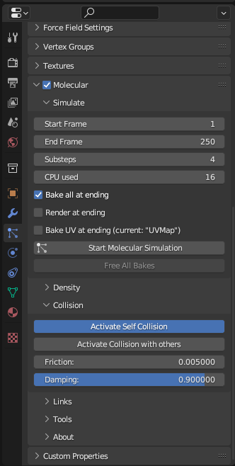 외부 Add-on을 설치하면 파티클 메뉴에서 [Molecular] 메뉴가 활성화 된다. 박스를 체크하고 [Collision] - [Activate Self Collision]도 활성화 한다. Damping 값을 조절하면 파티클이 튀지 않고 쏟아져나오는 형태가 된다.
