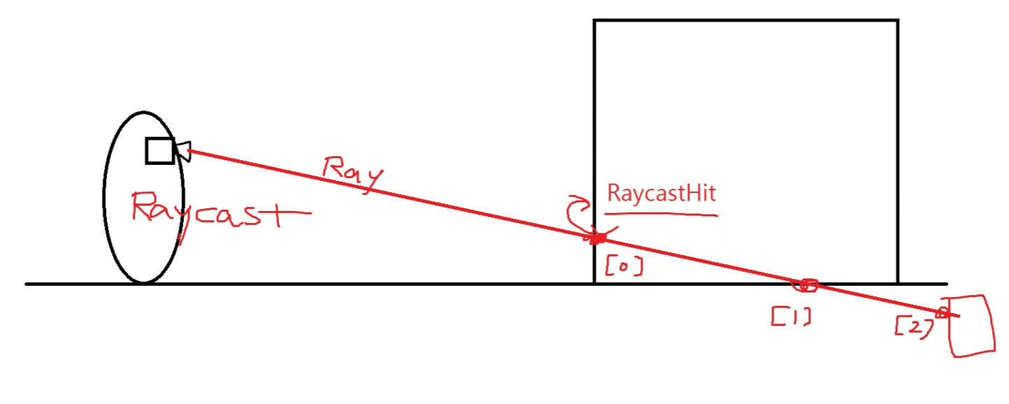빛 자체는 Ray, 빛을 쏘는 오브젝트는 RayCast, Ray가 맞은 부분은 RayCastHit