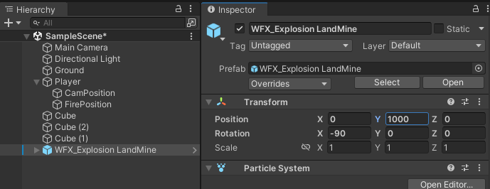 총 이펙트는 Hierarchy에 남고 쏘면 이펙트가 해당 부분에 이동하는 방식. 처음엔 Y축 1000으로 올려 보이지 않게 한다.