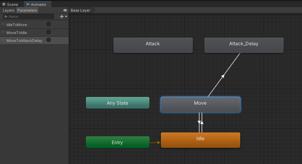 Move -> Attack_Delay 트랜지션 연결, MoveToAttackDelay 조건 추가