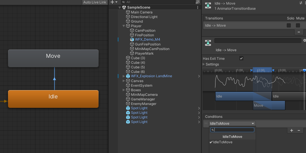 MoveToIdle 트리거 생성, Move -> Idle 트랜지션 생성, Condition 부여, Has Exit Time 체크 해제