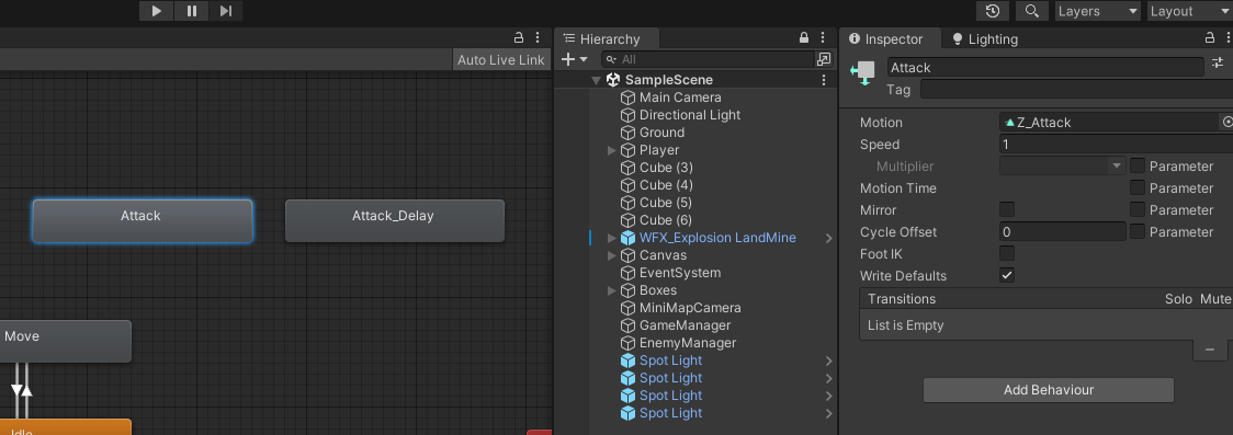 Attack, Attack_Delay 스테이트 생성, 각각 Z_Attack, Z_Idle 애니메이션 넣기
