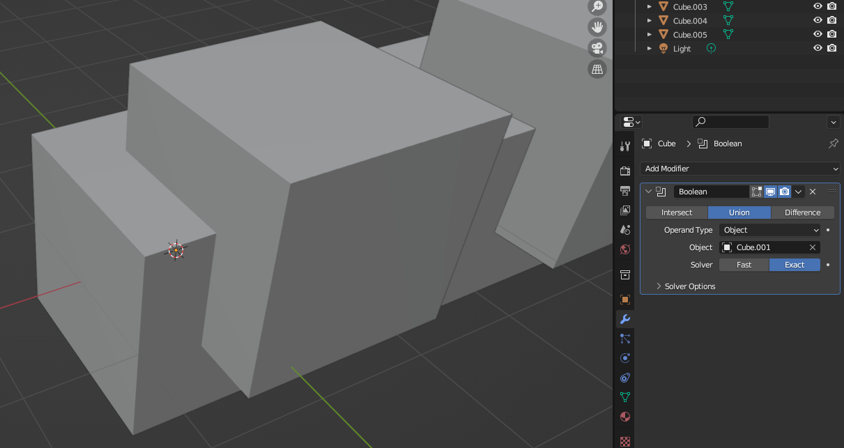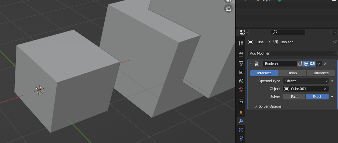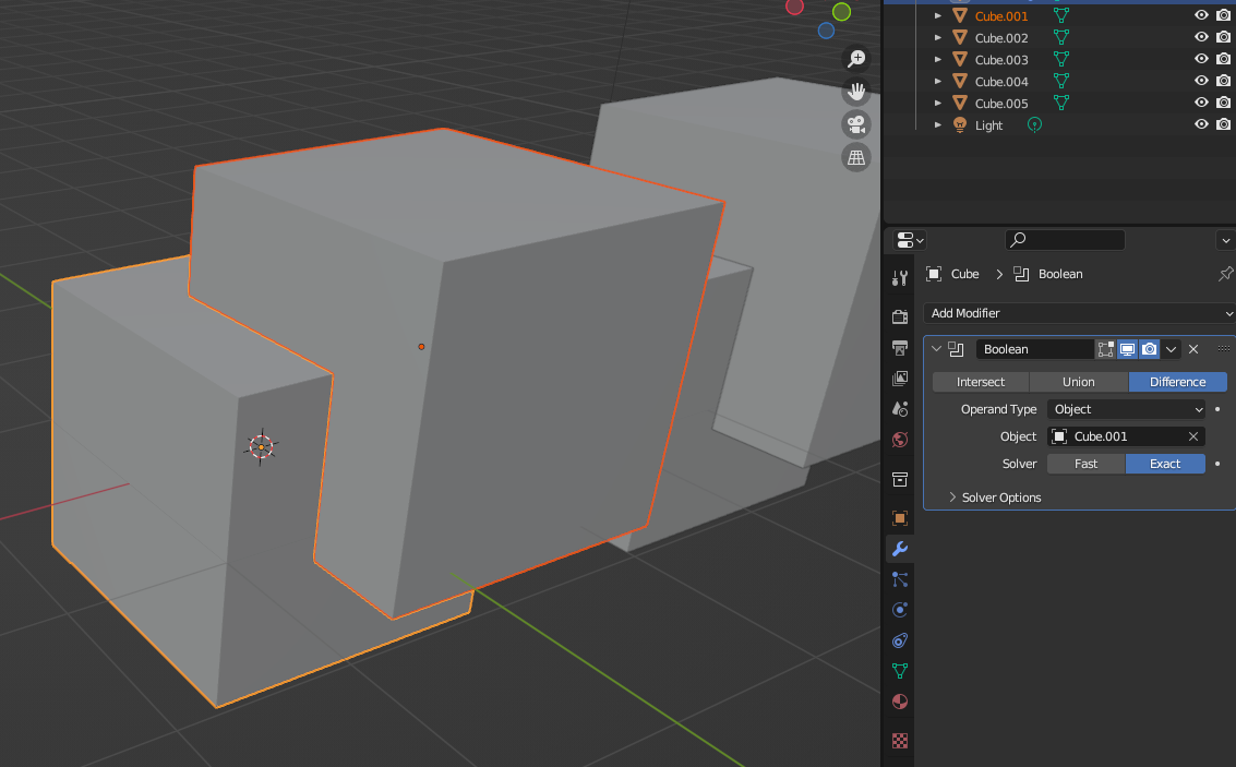 없어져야 하는 부분을 가진 오브젝트를 먼저 선택한 후 [Boolean] Modifier추가, [Object] 부분에 겹쳐져 있는 오브젝트를 넣으면 그 만큼 없어진다. [Difference]가 선택되어 있어야 함.