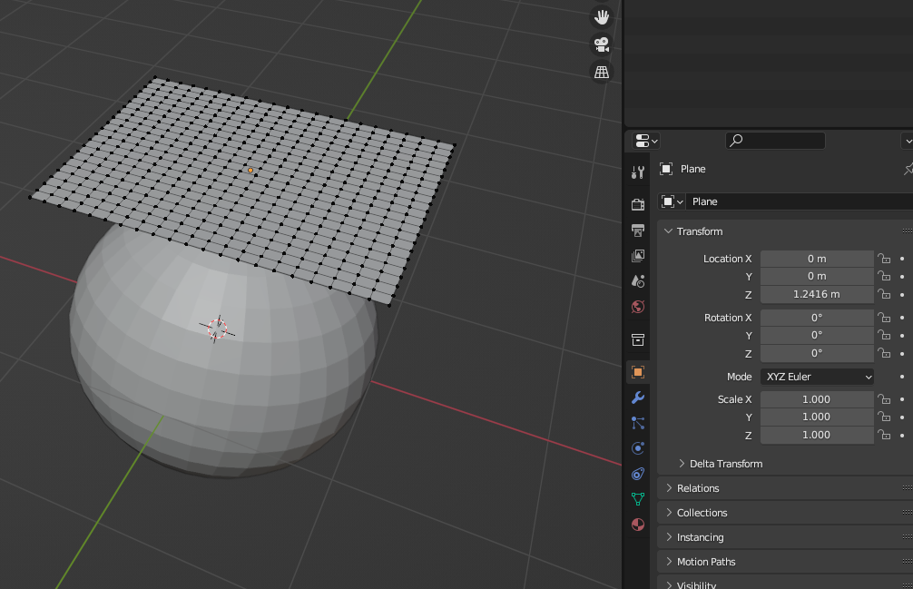 Plane에 [Shrinkwrap] Modifier 추가, [Target]을 Sphere로 설정한다. [Offset]으로 물체와 떨어트리기 가능