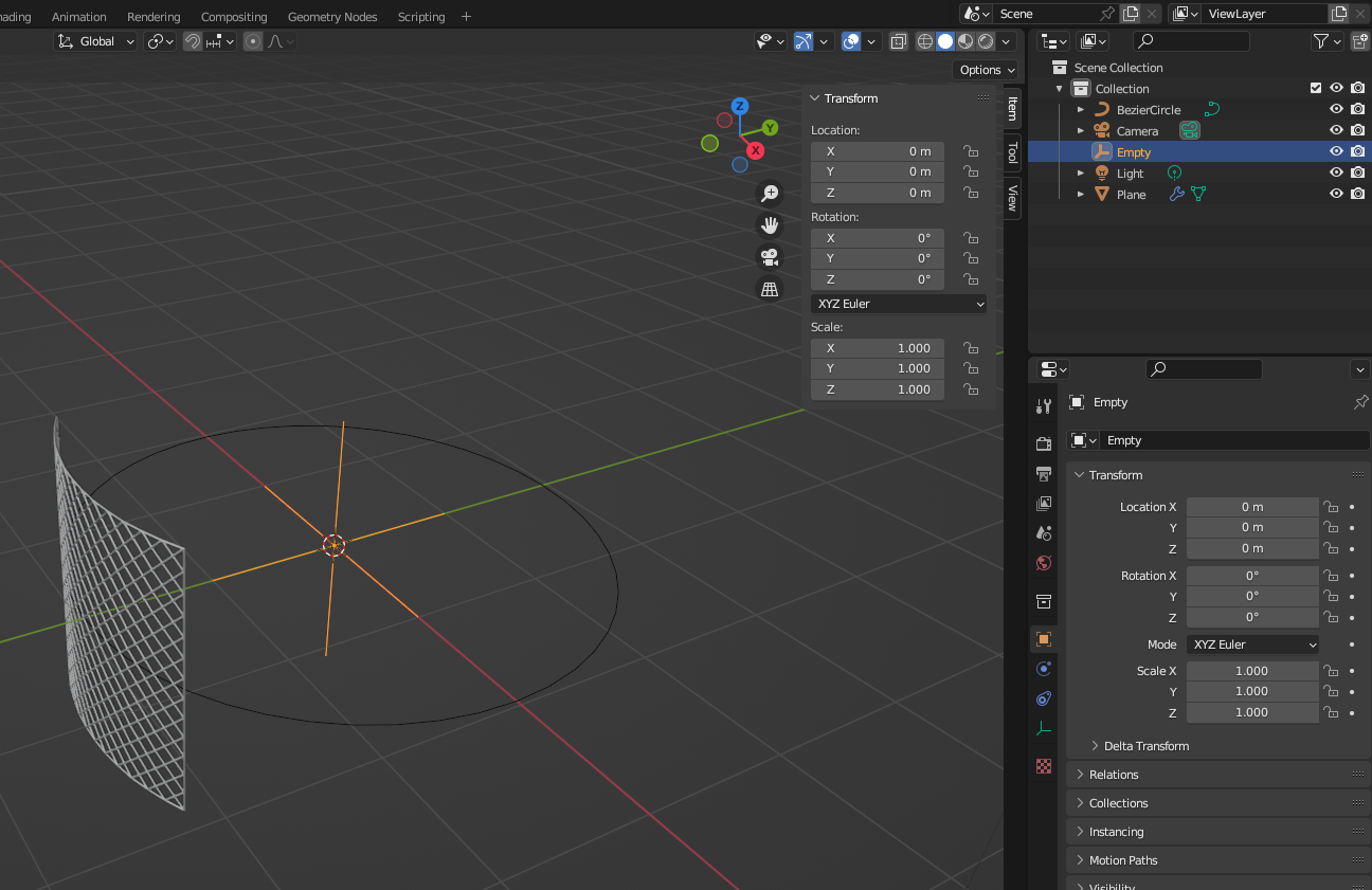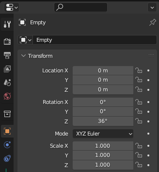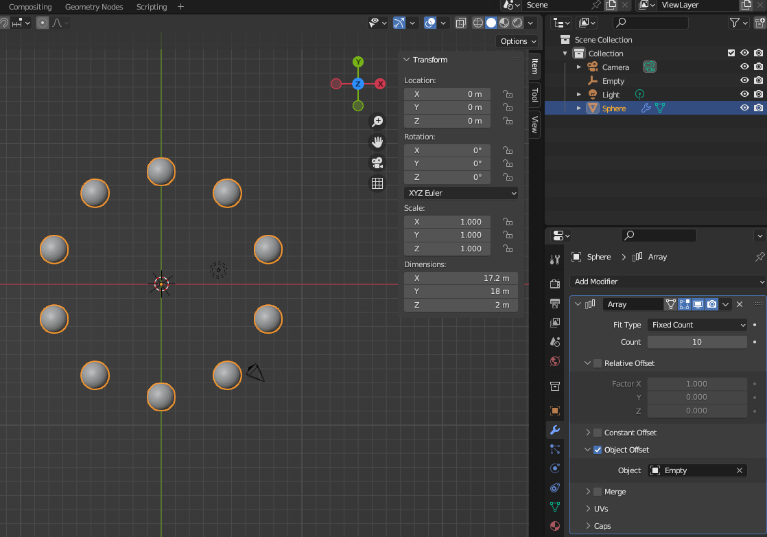 - Empty - Plain Axis 하나 만든 후 Rotation 설정(10개 만들 예정이므로 36도로), 스피어에 Array 생성하고 Object Offset을 Empty로 잡으면 원형으로 생성된다.