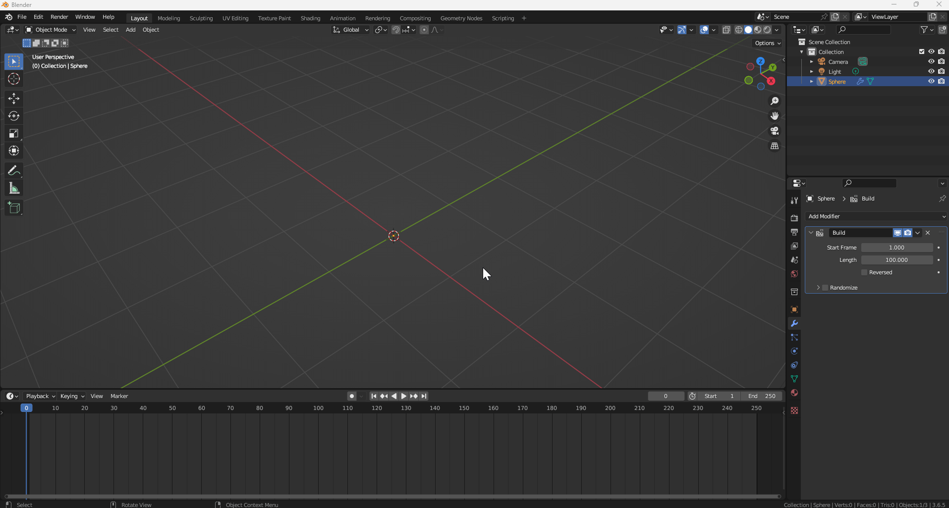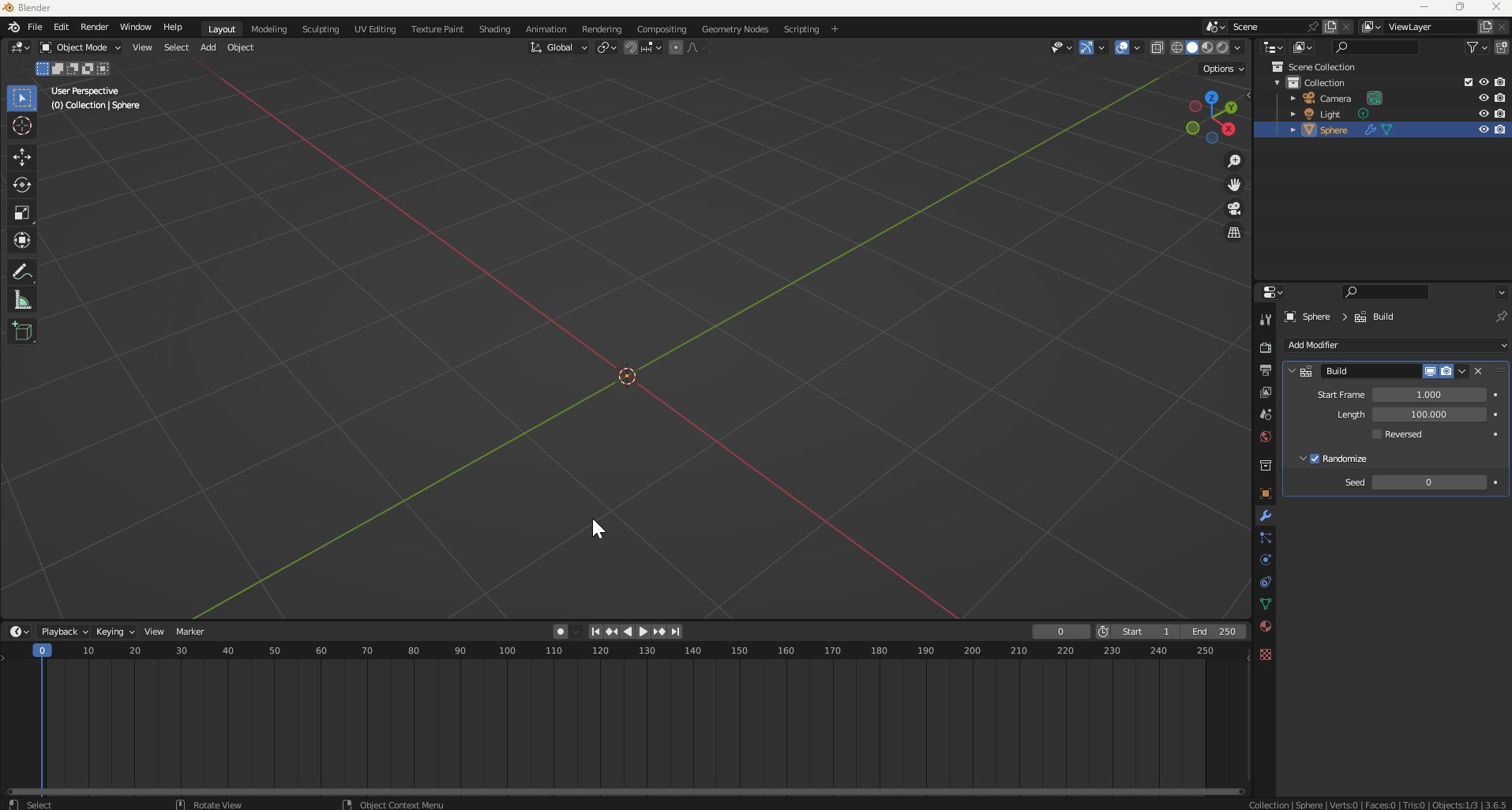 Modifier에서 [Build]를 주면 Timeline 재생 시 점점 형상이 만들어지는 것을 볼 수 있다.
