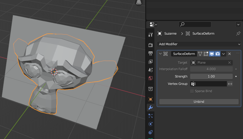 Monkey에 [SurfaceDeform] Modifier 추가하고 [Target]은 Plane으로 한다.