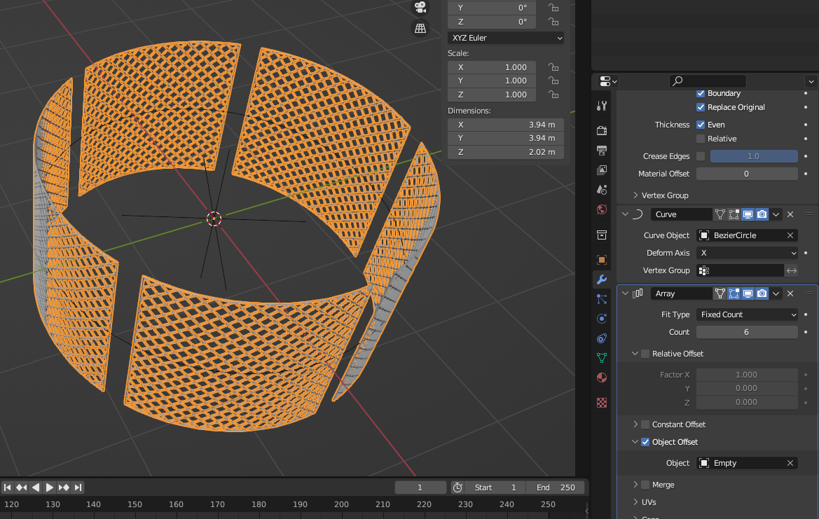[Array] Modifier 추가 / 'Ctrl + A' - [All Transforms] 후에 [Array] Modifier 설정 변경 / Empty Z축 각도 주기