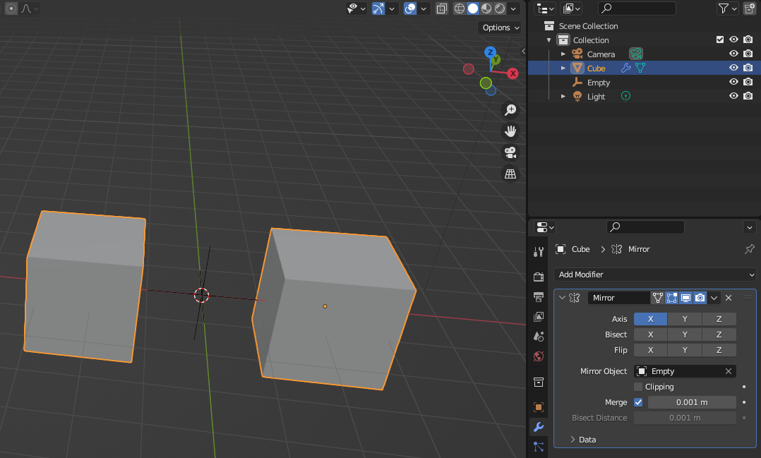 Empty 하나를 기준 축으로 만들고 큐브에 [Mirror] Modifier를 추가한다.