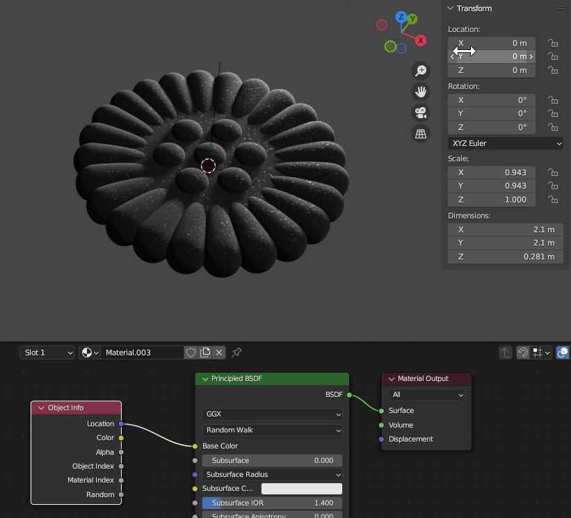 [Object Info] - [Location]을 [Base Color]에 입력하면, x, y, z의 위치 값이 각각 R, G, B와 연결되어 위치가 바뀌면 색이 바뀐다.