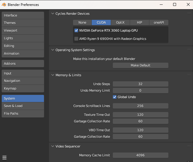 **[Preferences] - [System] - [None]에서 이외에 다른 방법을 선택해야 GPU Cycles 렌더링이 빠르게 진행된다.
