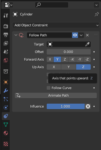 [Constraints] 메뉴에서 [Follow Path]를 추가한다. [Target]을 아까 만든 Bezier 커브로 두면 실린더가 커브에 붙는다.