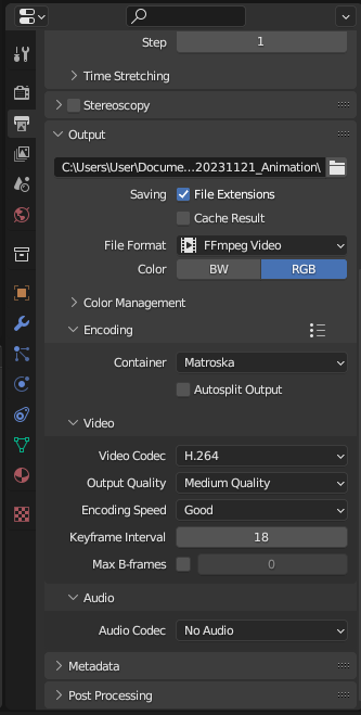 애니메이션을 영상으로 렌더하고 싶다면, [Output] 메뉴에서 [File Format]을 영상 확장자로 변경한 후 세부 내용을 설정하면 된다.