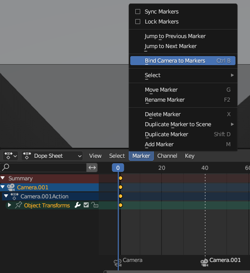 원하는 프레임에서 [Marker] - [Bind Camera to Markers] 선택. 이후 다른 프레임에서 다른 카메라 선택, 같은 작업을 해서 다른 카메라로 돌린다.