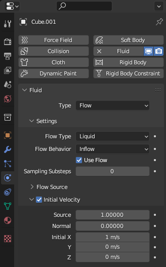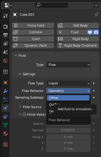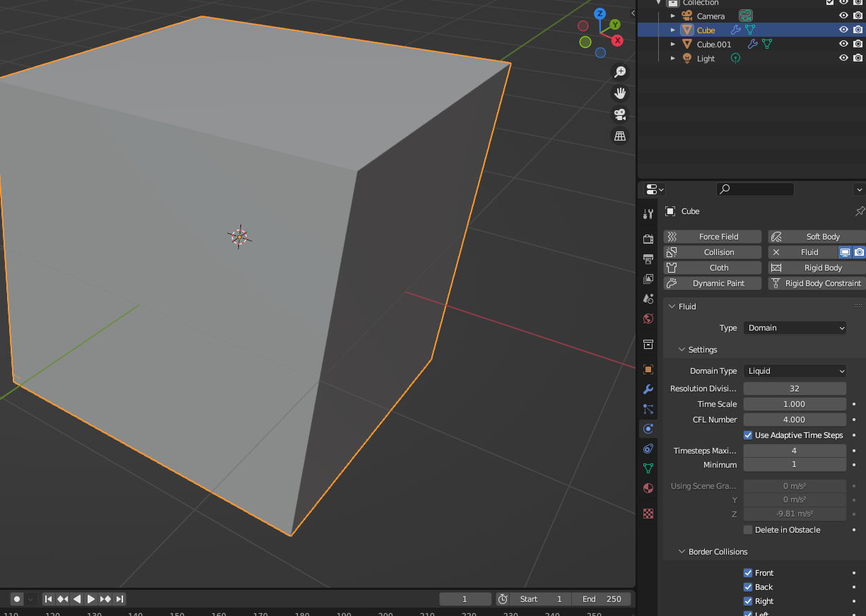 채워지는 크기에 맞게 큐브를 하나 새로 생성하고 [Constraints] - [Fluid]를 적용한다.