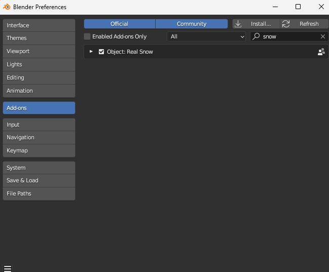 Real Snow라는 Add-on을 사용할 수 있다. 정말 눈이 내려 쌓인 것처럼 보인다.