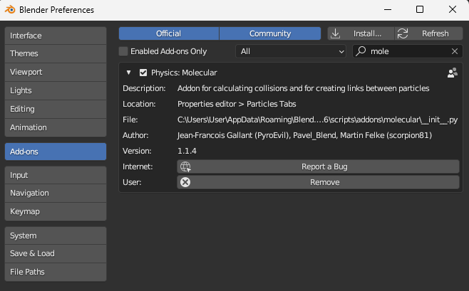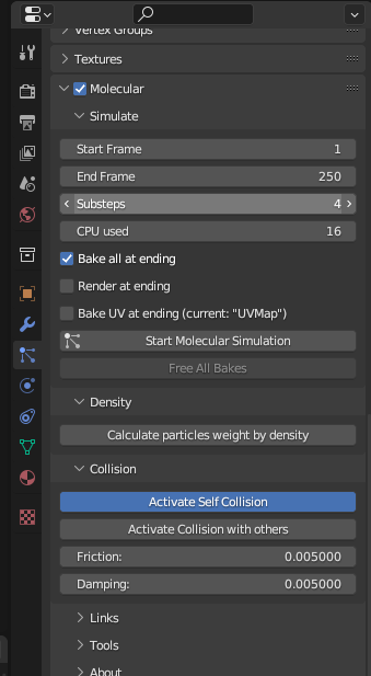 Add-on으로 추가한 Molecular를 설정하고 [Rotation] - [Randomize]를 최대로 올리면 랜덤한 회전 값을 가진 파티클이 생성된다.