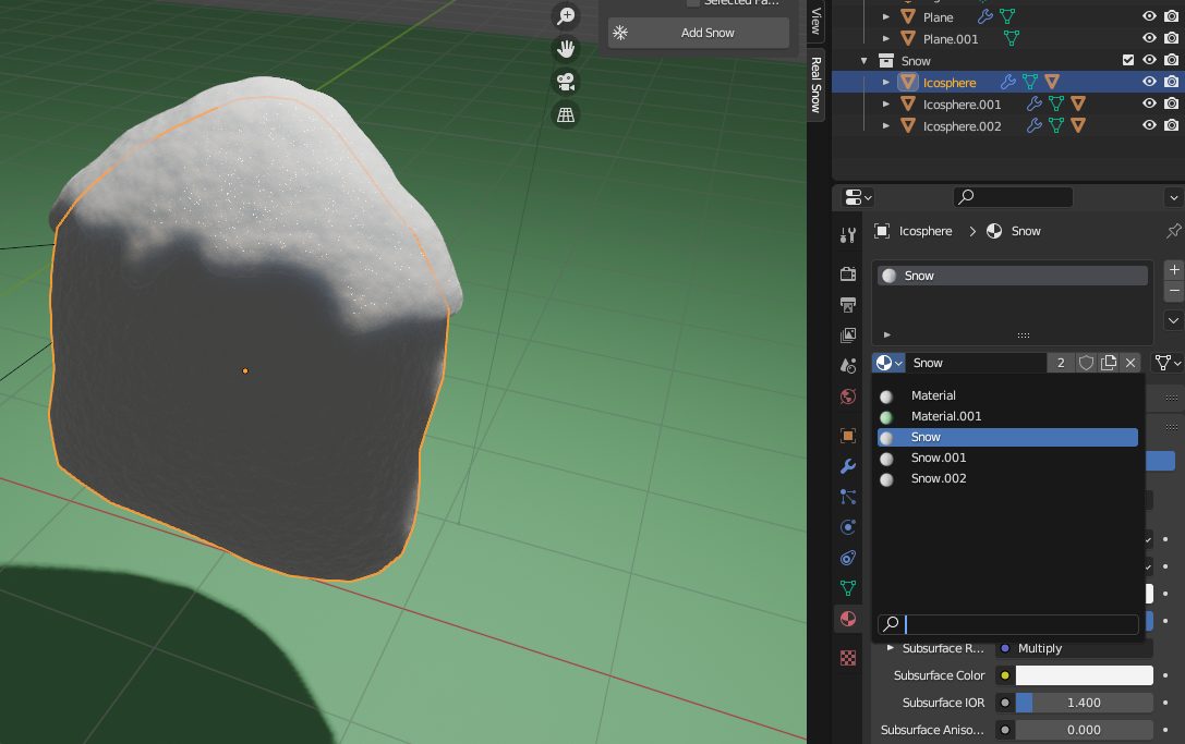 우리는 눈의 재질만 가져올 것이기 때문에 Add-on을 적용하여 자동으로 만들어졌던 Snow 메테리얼을 Ico Sphere에 적용한다.ㅣ