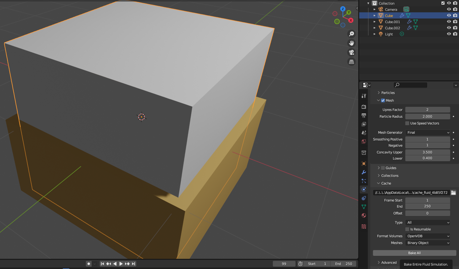 [Diffusion] 체크, [Mesh] 체크, [Cache] - [Type] - [All] 선택, [Bake All]을 먼저 선택해서 시뮬레이션을 계산한다.