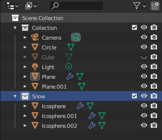 [Particle] 메뉴 - [Render] - [Render As]를 [Collection]으로 바꾸면 내가 만든 컬렉션이 눈처럼 내리게 된다.