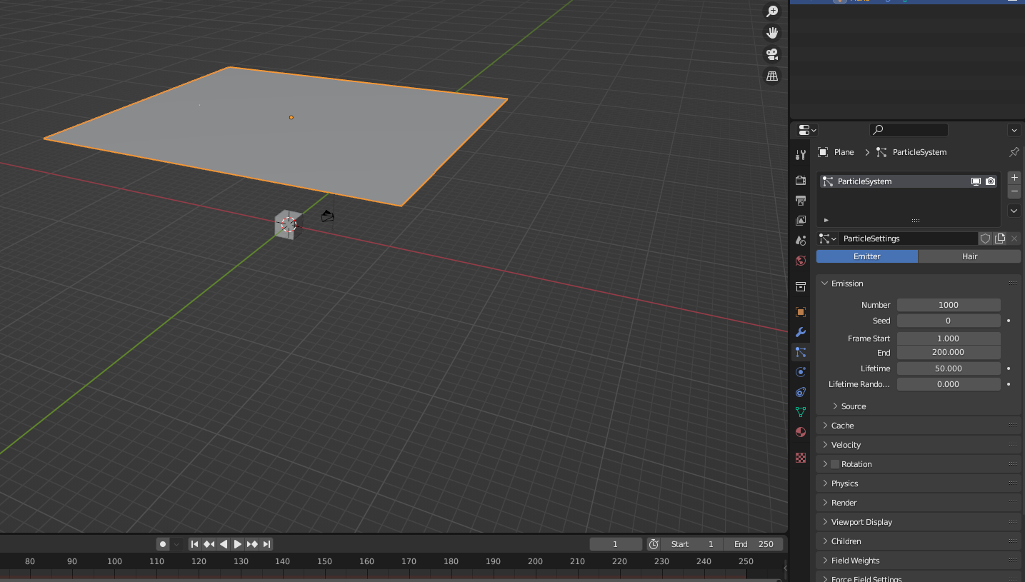 Plane 생성, [Particles] 메뉴에서 파티클 시스템 생성