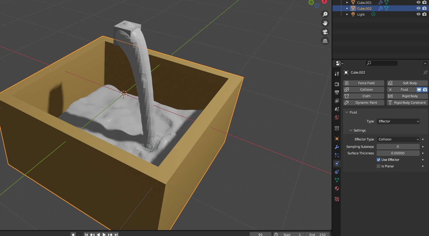 물줄기 중간에 [Constraints] - [Effector] - [Collision] 설정한 물체를 놓아도 되고 넘쳐 흐르게도 할 수 있다.