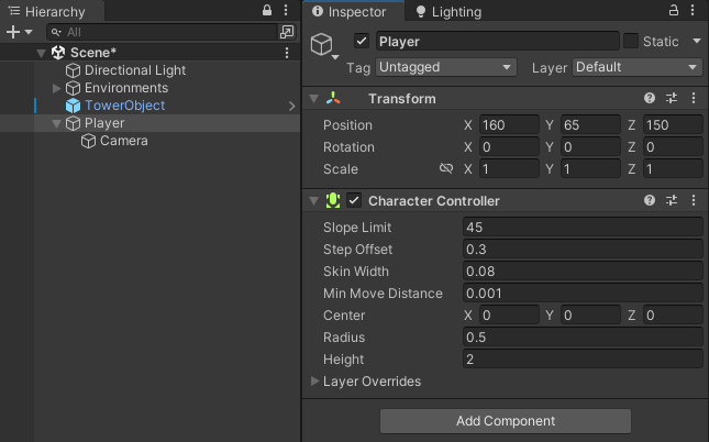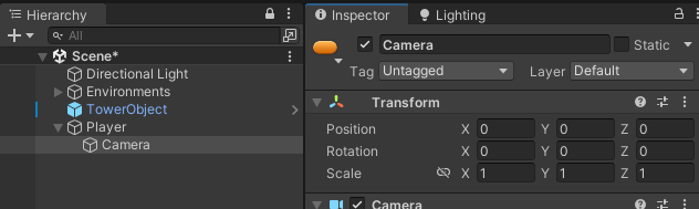 플레이어가 두리번 거리게 만들기 위해 카메라가 플레이어의 눈에 위치한다. 카메라를 플레이어의 자식 오브젝트로 둔다. 카메라의 Transform은 리셋.