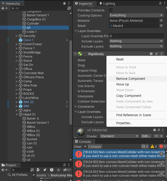 오류를 클릭해서 나온 오브젝트의 Rigidbody 전체 제거