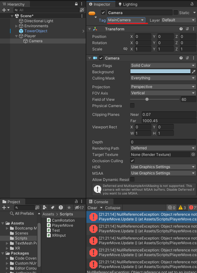 발생한 오류는 Camera의 Tag가 MainCamera가 아니었기 때문이다. MainCamera로 Tag를 수정한다.