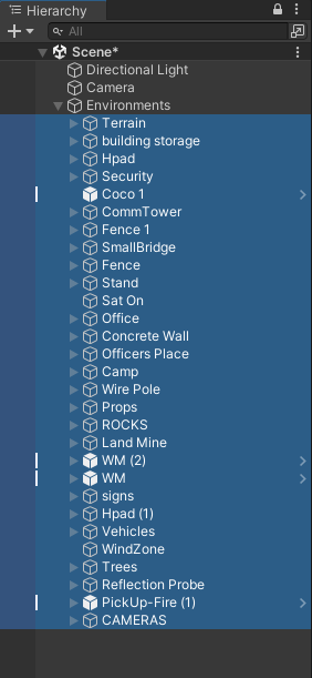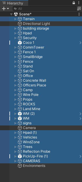 에셋 씬 수정을 한다. Directional Light과 Camera를 뺀 나머지를 하나의 그룹으로 묶는다.
