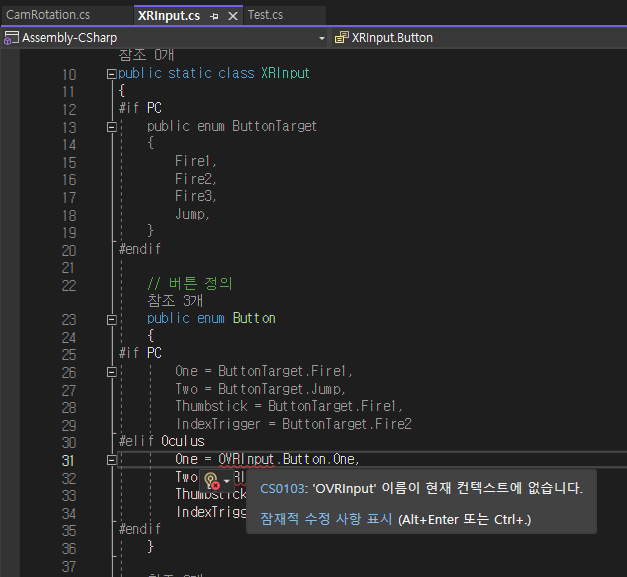 아래와 같은 오류는 에셋 스토어에서 Oculus Integration을 다운받으면 해결된다.