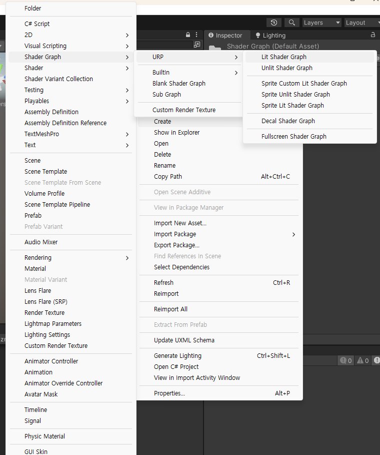 [Create] - [Shader Graph] - [URP] - [Lit Shader Graph]를 생성한다.