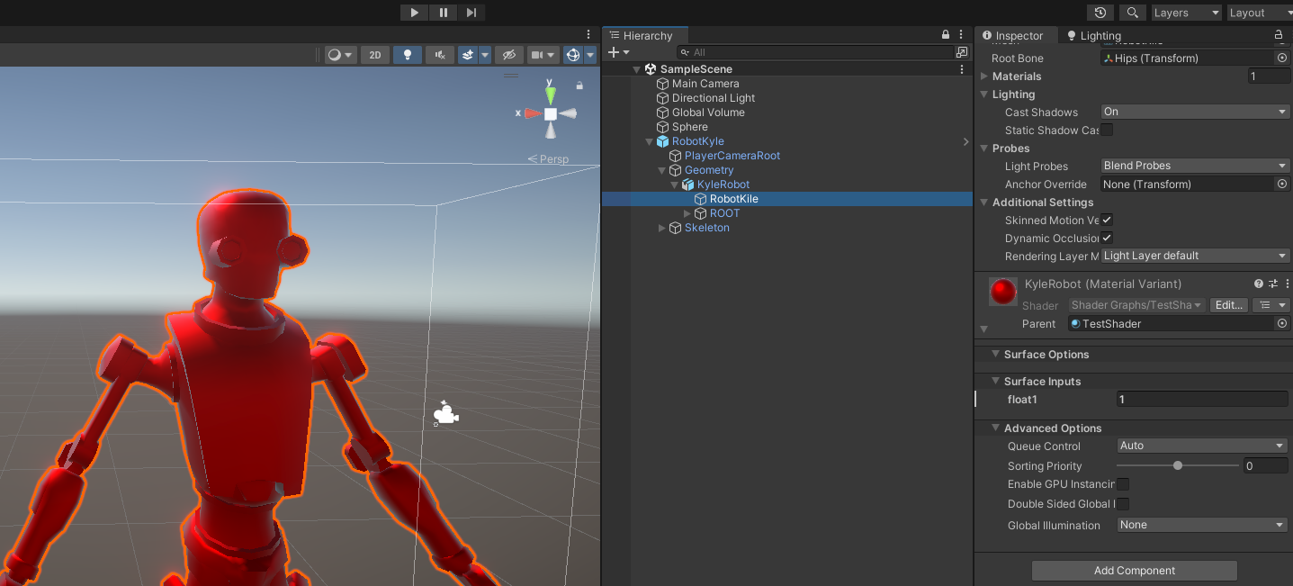BaseColor는 그대로 유지한 채로 Emission에 셰이더 그래프를 적용하여 표면이 붉게 빛나게 설정한다. Sine Time으로 시간에 따라 깜빡이도록.