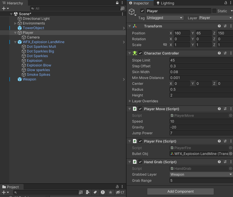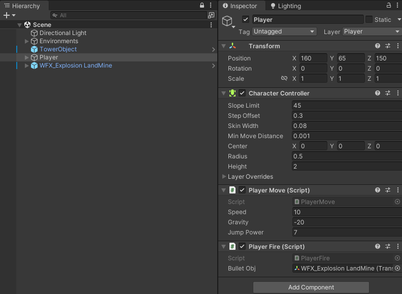 스크립트를 Player에 넣고 비어있는 Bullet Obj에 파티클 프리팹을 넣는다.