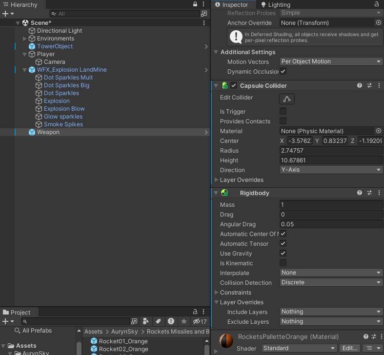 폭탄 에셋에 Capsule Collider, Rigidbody 추가, IsKinematic 활성화