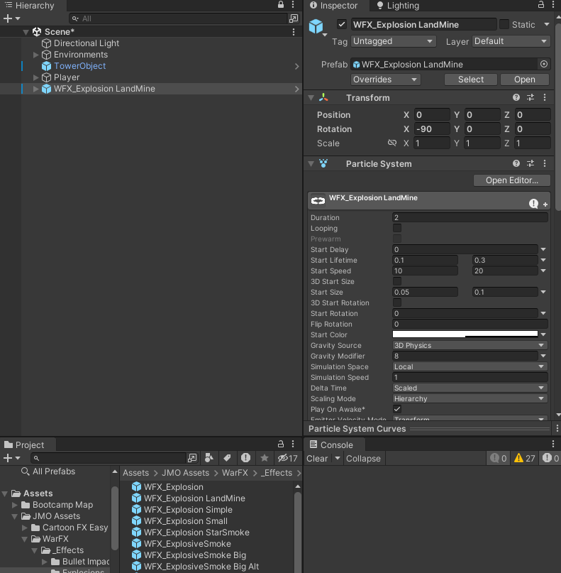 에셋 효과 하나 선택해서 Hierarchy로 가져오고 안에 원래 들어있는 스크립트 삭제