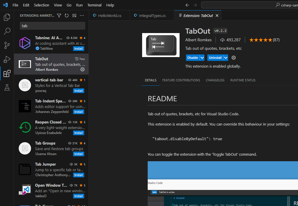 Tab으로 괄호를 넘어가기 위해 TabOut 설치한다.