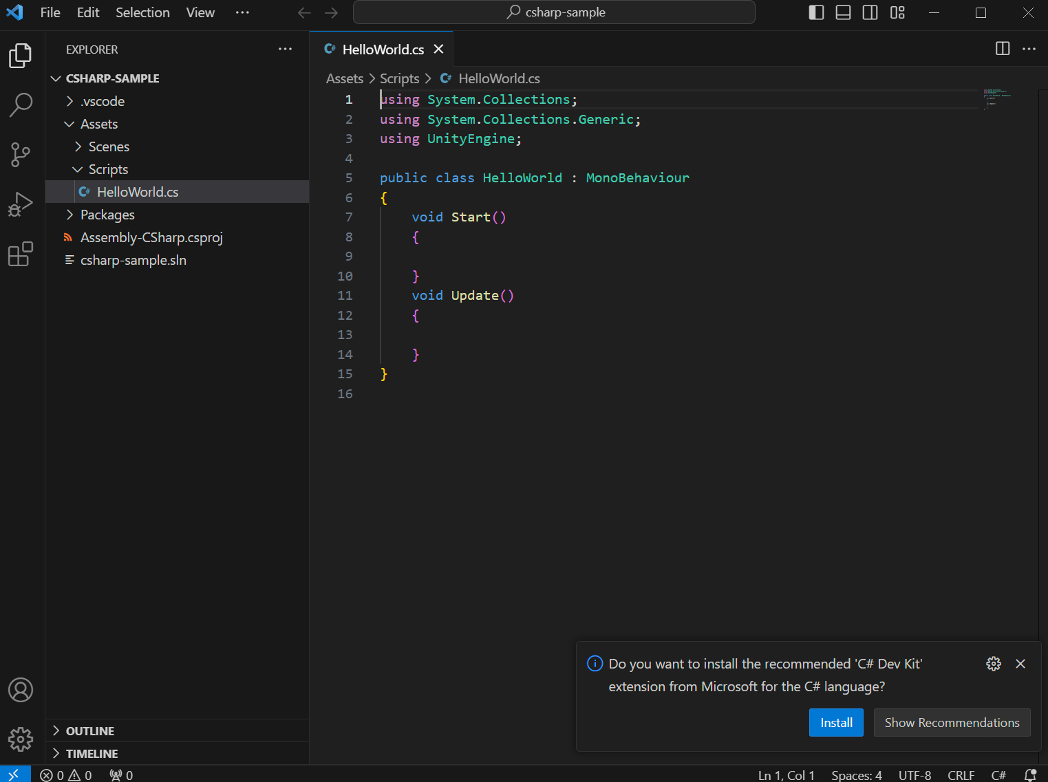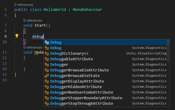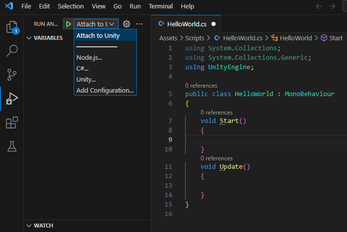 Run - Attach to Unity가 뜨고 자동완성이 된다면 유니티와 VScode의 연결이 완료된 것이다.