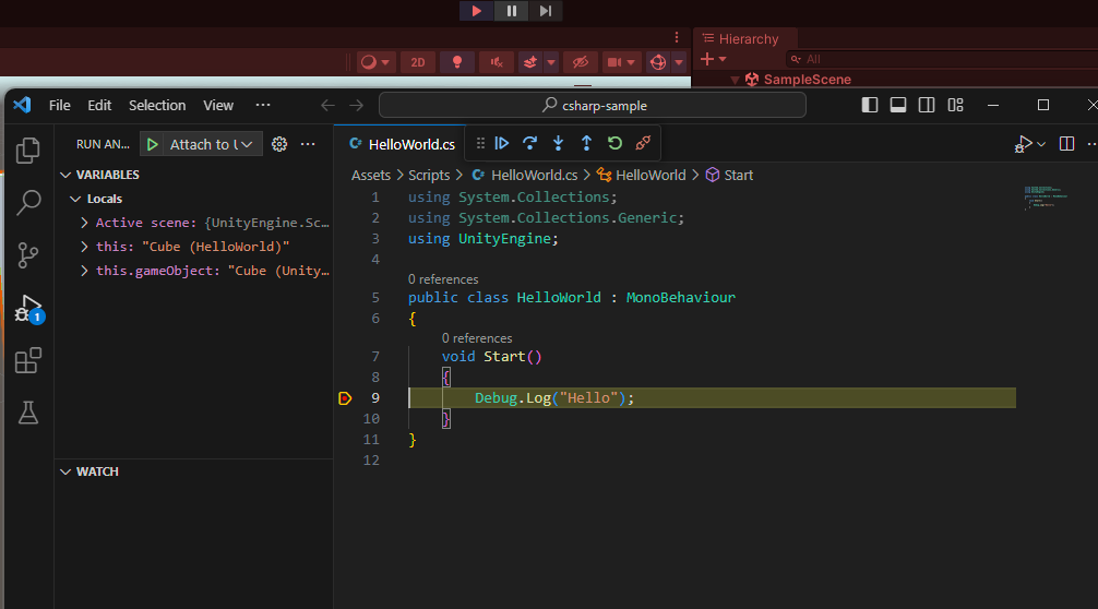 BreakPoint 설정 후 코드 실행하고, Unity로 돌아가 씬을 실행하면 BreakPoint 부분에서 멈춘다.