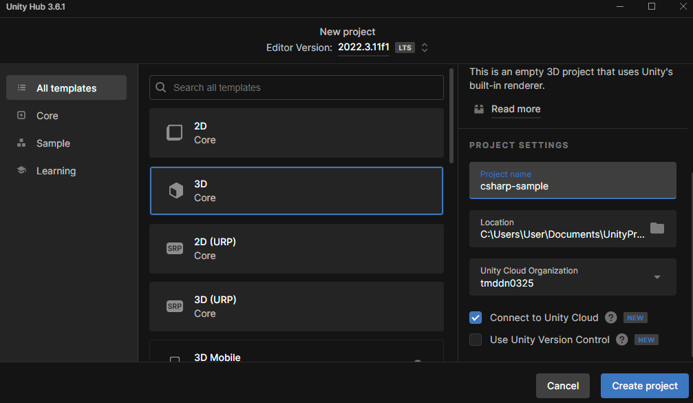 Connect to Unity Cloud는 샘플 예제 같은 경우 체크를 해제한다. Cloud에서 잘 삭제가 되지 않음.