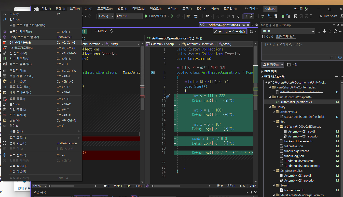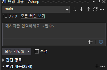 Visual Studio에서 [보기] - [Git 변경 내용]을 열면 변경 사항을 볼 수 있다.