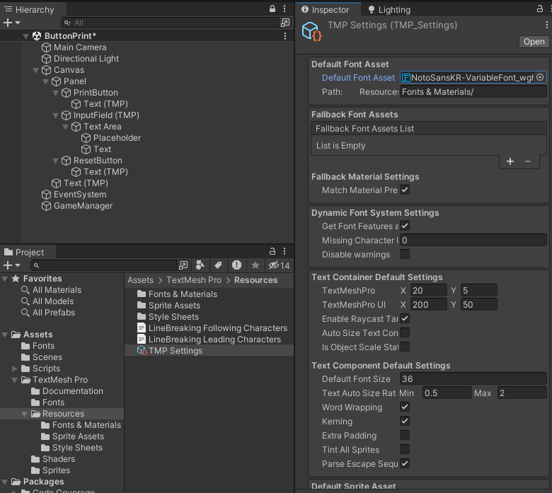 그리고 Project에서 [Assets] - [TextMesh Pro] - [Resources] - [TMP Settings]의 Inspector에서 [Default Font Asset]을 다운 받았던 폰트로 변경한다.