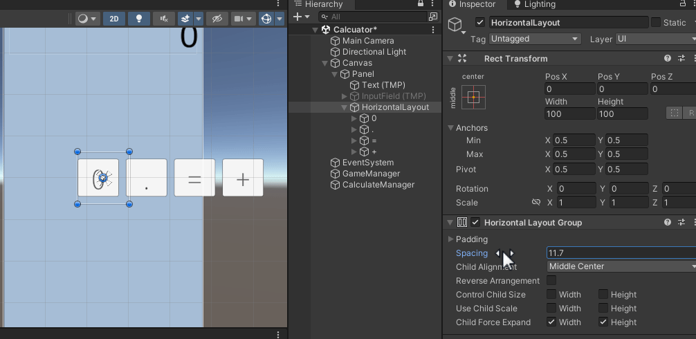 GameObject 생성 - 버튼 4개 넣기 - Horizontal Layout Group 컴포넌트 추가