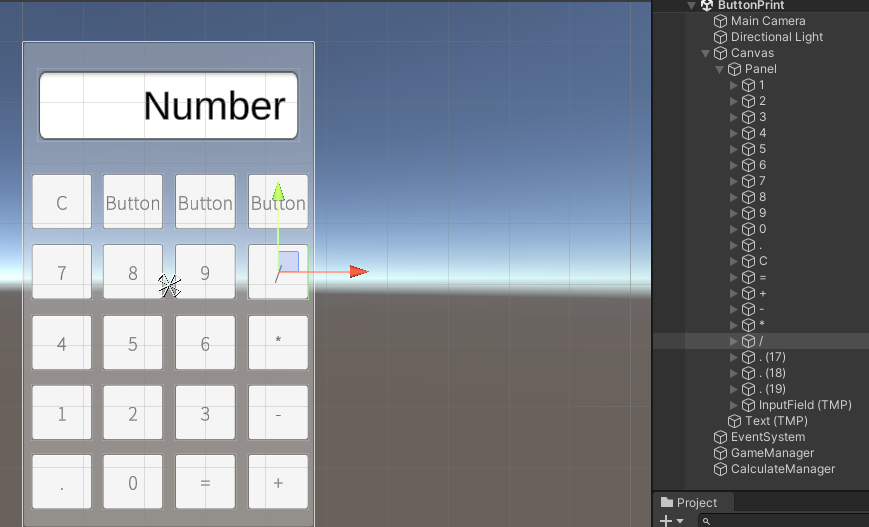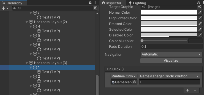 매개변수를 추가하면 On Click() 란에 빈 칸이 생성되고, 모든 버튼에 같은 함수를 넣고 매개변수 칸에는 해당하는 숫자와 기호를 넣으면 된다.