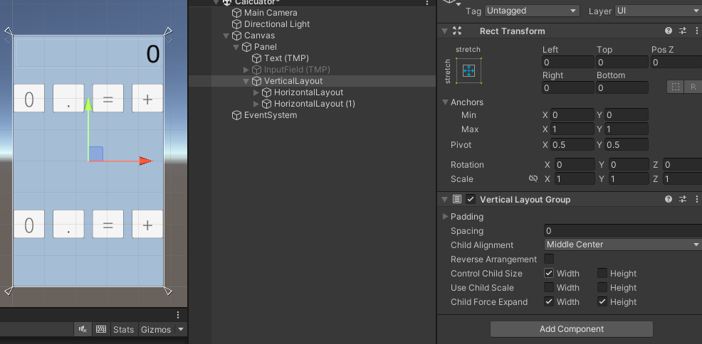 GameObject 생성 - HorizontalLayout 넣기 - Vertical Layout Group 컴포넌트 추가